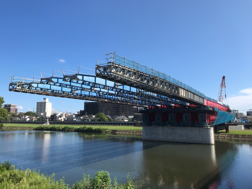 9月末時点での現場状況をご報告いたします。9月5日に橋げたの最終ブロック架設が完了しました。引き続きの作業として橋げた後方部の連結構・仮設工事桁および桁降下で使用するセッティングビームの取付も完了しております。9月23日よりA1橋台(太白区側)での作業をメインで行っており、支承(橋台と橋げたを繋ぐ部材)の組立は完了し、現在は橋台上での送出し設備の組立を行っています。送出し設備の組立が完了後、ジャッキ等の最終点検を行い10月7日よりA1橋台へ向けての送出し架設を行っていく予定です。手延べ機(橋げた先端の仮設部材)がA1橋台の設備上へ到達後は、昼夜作業で送出し⇒手延べ機解体を繰り返し行っていきます。昼夜作業の区分けとして、昼間作業は送出し架設⇒手延べ機解体、夜間作業では引き続きの手延べ機解体⇒機材搬出を繰り返して進めていく予定です。